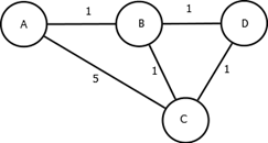 重复上面的操作,建立表格第5行。此时集合U中只包含{D},节点C为中间点。由图可知C->D的距离为1。而A->C的最短距离已经求出,在上表中C列第4行,为2(经过节点B)。故A->B->C->D的距离为2+1=3。表中D列第4行记录到达D点的最小路径为2(通过B点),求两条路径的最小值min(2,2+1)=2。即D点的最小路径为2,将2写入D列第5行并对D列第5行进行标记。此时集合U为空集,集合S中的元素为{A、B、C、D},计算完毕。表中第5行所记录数据即为A点到各点的最小路径值。