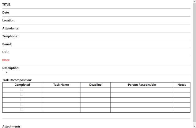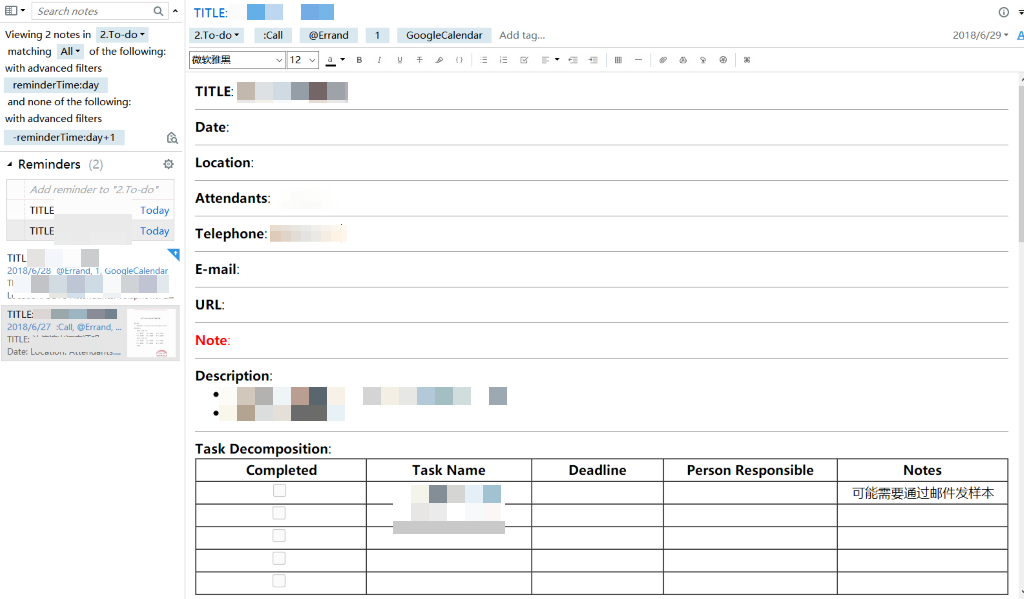 可以看到,我为GTD专门创建了一个笔记本栈(Stack),将可能需要去做的事情放入“1.Maybe To-do”中。已经确认需要执行的任务则放入到“2.To-do”笔记本中,如果是需要将来某天需要做的,则被设定为Reminder 。“3.Waiting”笔记本用来存放那些进行了一半的任务,但因客观原因需要等待才能继续的任务。第四个笔记本“4.Done”用来存放已完成的任务,定期清理。最后一个笔记本“7.Goals”就不用多说了,无非是存放一些将为长远的目标。“Template Library”中我存放了自己设定的一个简单的任务模板,当需要设定一个任务时,直接拷贝到“2.To-do”笔记本中去,然后填写相应内容。下图便是我的任务笔记模板抓图: