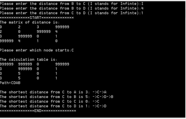 最近学习Dijkstra算法和C#,用C#写了一个Dijkstra算法的演示程序。图中的节点要求使用26个字母来表示。节点之间的距离为整数,不相邻节点输入”I”或”i”来代表Infinite。该程序移除了输入的冗余,并且显示输入节点和距离后的邻接矩阵。同时会在最终结果给出前,打印出 Dijkstra算法的计算过程表和最短路径点的次序(path数组)。在代码中给出了详细的注释,对于学习Dijkstra算法的人具有一定帮助。